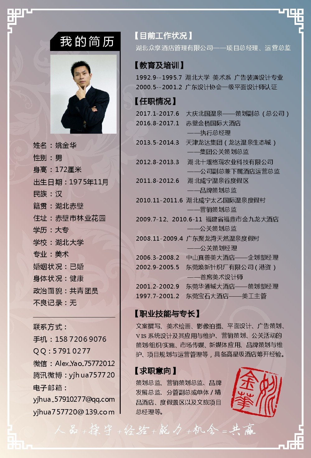期望職位:廣告策劃,企業(yè)規(guī)劃,副總經(jīng)理,總經(jīng)理,酒店管理